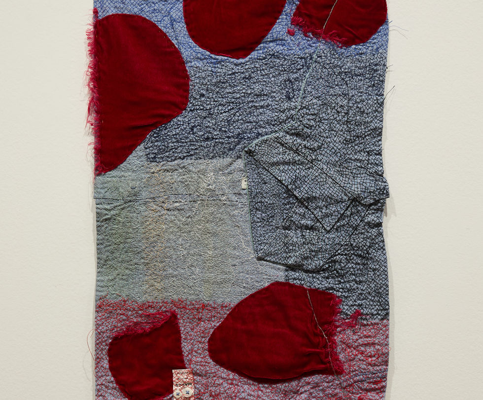 Remediation VI, 2022, thread and fabric offcuts on men’s shirt, 59,5 x 53 cm, photo by Shane Rozario